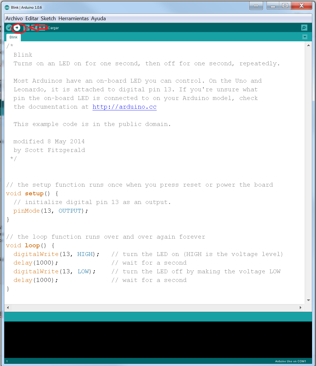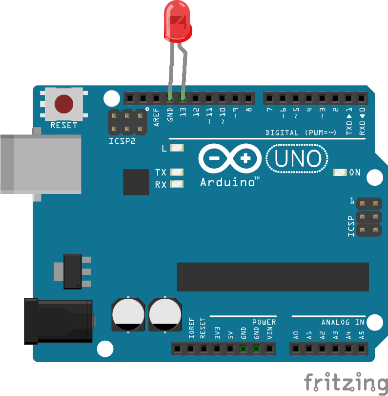 Cabe destacar que, aunque todavía no vamos a entrar en detalles, un led siempre se debe conectar a la placa con una resistencia. En este ejemplo no lo necesitamos, puesto que el puerto 13 es un puerto especial, que ya lleva asociada una pequeña resistencia, suficiente para no sobrecargar el led.