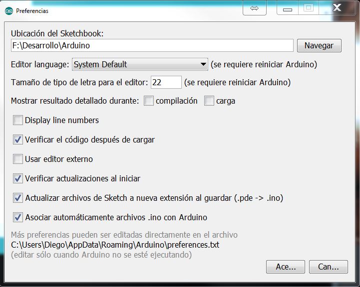 En la ventana de preferencias, seleccionamos la Ubicación del Sketchbook, esto es, dónde se guardarán nuestros proyectos. Yo, por cuestiones de organización, tengo creada una carpeta de «Desarrollo» en la raíz de mi disco duro, dentro de la cual creo un subdirectorio por cada entorno de desarrollo, en este caso, «Arduino». El resto de opciones las dejamos marcadas como aparece en la imagen: