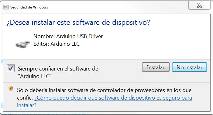 Nos saldrá una alerta de seguridad de Windows, preguntándonos si queremos instalar este software de dispositivo (Arduino USB Driver). En esta ventana, vamos a marcar ‘Siempre confiar en el software de «Arduino LLC».’, para que no nos lo vuelva a preguntar más, y le damos a «Instalar».