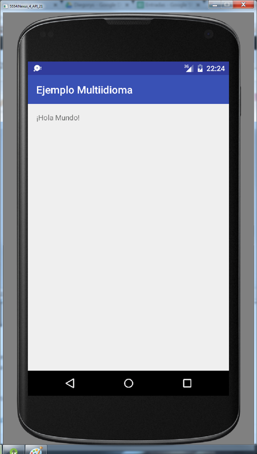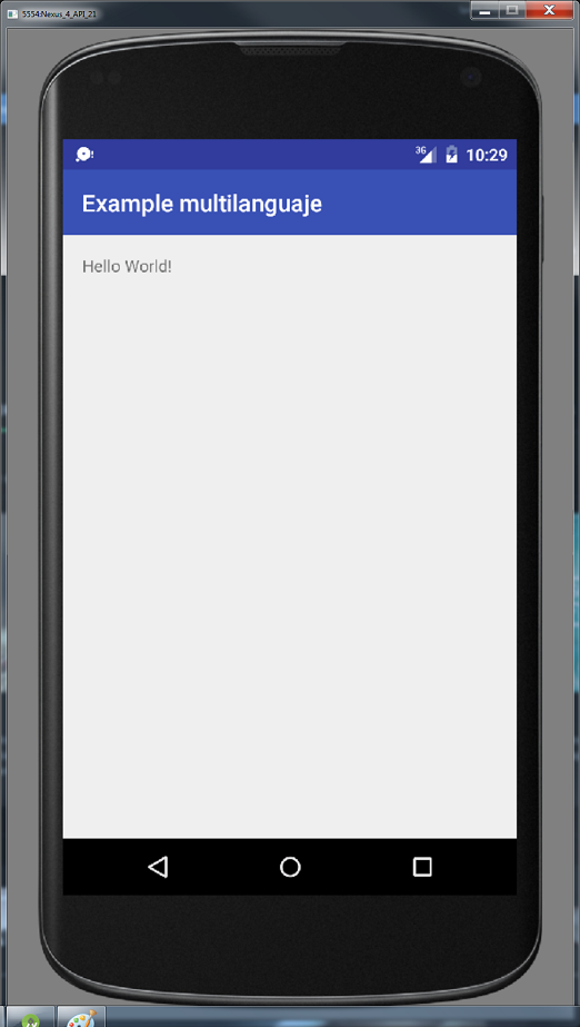 El ejercicio consiste en acceder hacer una aplicación en inglés y español, según las preferencias del móvil. Para ello, se crea la carpeta para inglés «app/src/main/res/values-en«, donde se creará su propio «strings.xml«. Si en los ajustes del móvil (o en el emulador) se selecciona como idioma «en«, se mostrará el texto en inglés. En cualquier otro caso, se muestra el idioma por defecto, en este caso, español.