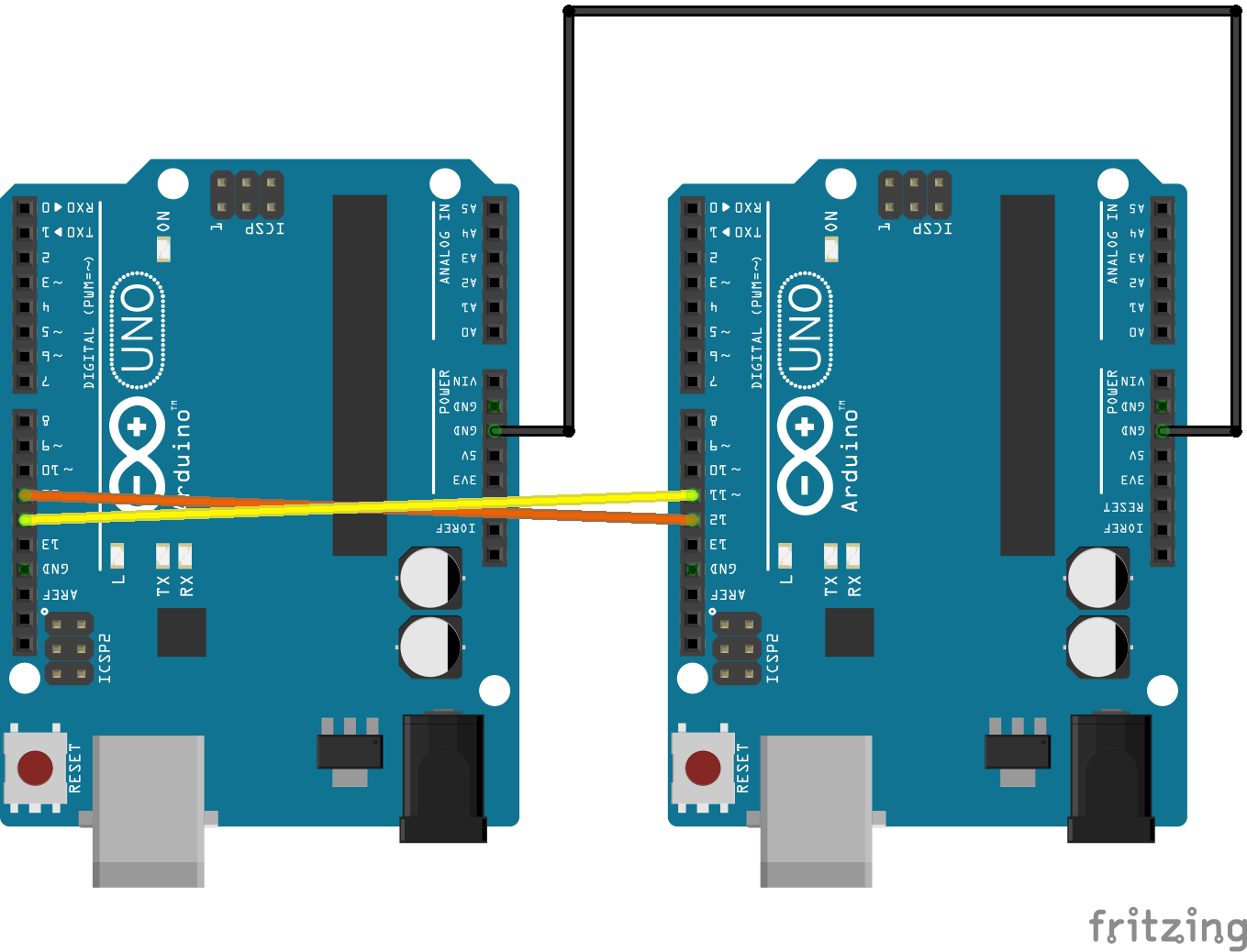 Conectamos el pin que elijamos como RX de una placa al pin TX de la otra placa y viceversa. En mi caso, uso el pin 11 como RX y el 12 como TX. También debemos conectar las tierras de las dos placas para que funcione, según el esquema: