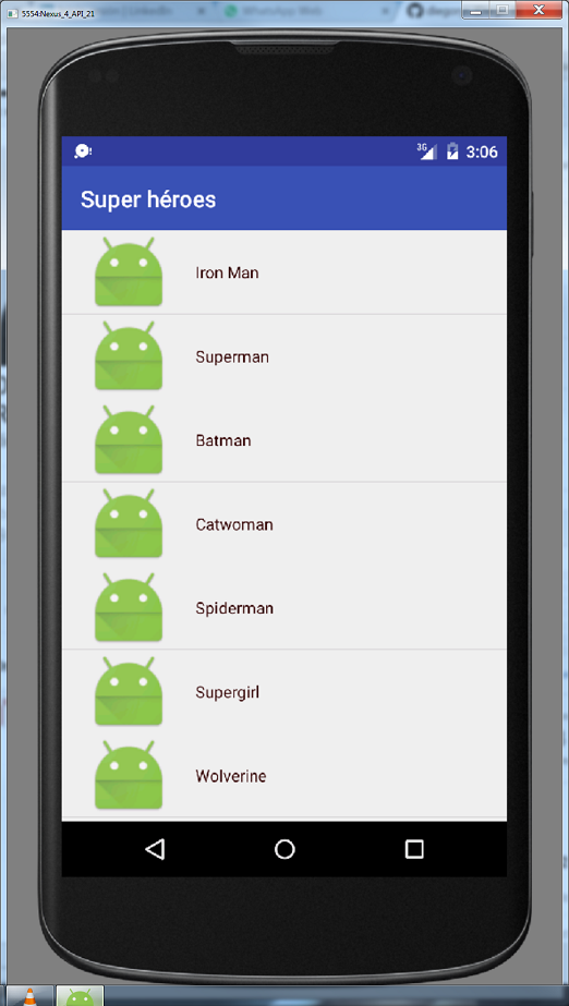 El ejercicio consiste en crear una lista básica con un array de objetos de la clase SuperHeroe, que tienen un icono y un nombre. Se ha tenido que crear un Adapter personalizado capaz de mostrar el icono y el texto. Al pulsar en cada elemento, se muestra el nombre del super héroe.