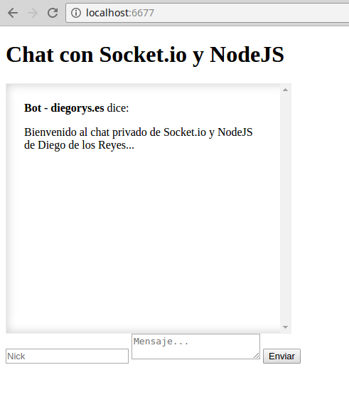 Este ejemplo lo he desarrollado durante el curso Crear una aplicación web de Chat con NodeJS y SocketIO y consiste en un chat en tiempo real.